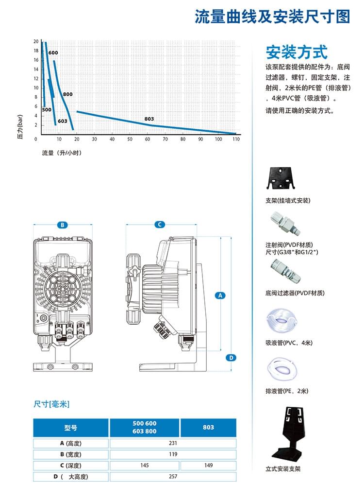 備注:完整的標(biāo)準(zhǔn)安裝配件包括:底閥過濾器及注射閥、PVC吸液管,PE排液管及固定支架。