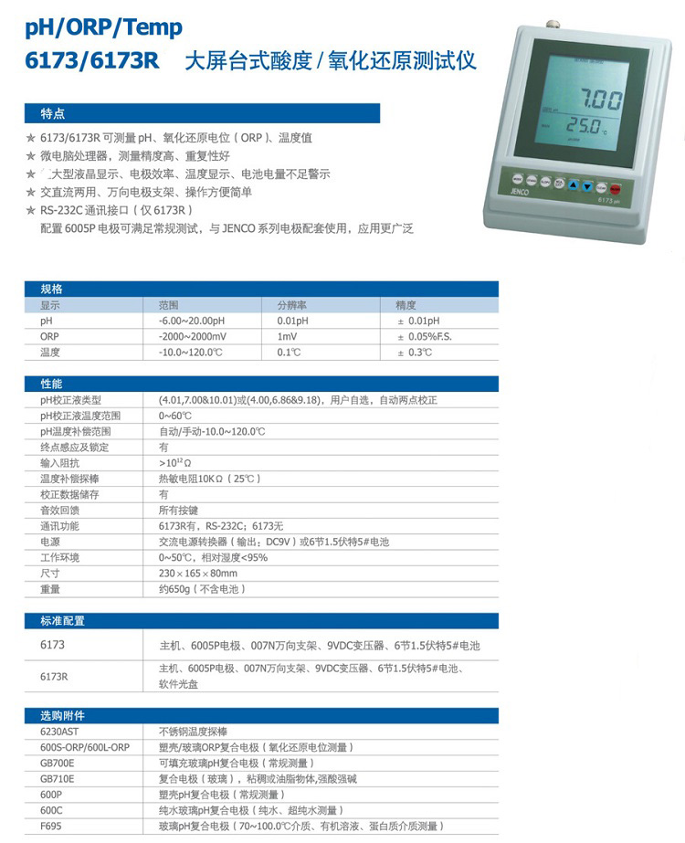 參數:-6~20/0.01pH,-2000~2000/1mV,手動/自動溫補-10~120℃,兩點校正