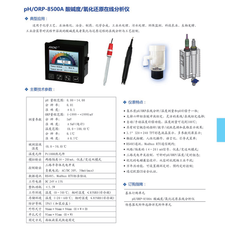 pH/ORP-8500A酸堿度/氧化還原在線分析儀是集pH/ORP/溫度測量于一體的高準確度、高性價比的酸堿度/氧化還原電位變送控制儀表,以32位ARM處理器為核心的強大內核與操作系統,使得信息處理速度和測量準確且穩定,在儀表行業率先采用大型彩色屏幕的多參數同屏幕顯示。