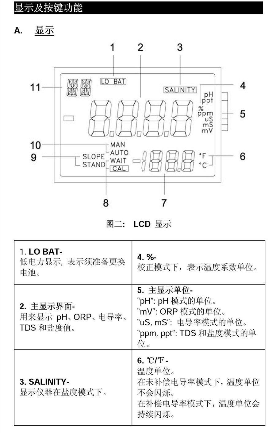 參數:-2~16/0.01pH,-1500~1500/1mV,0~80ppt,0~30.0mS/0.01μS,手動/自動溫補-5.0~75.0℃,RS-232C