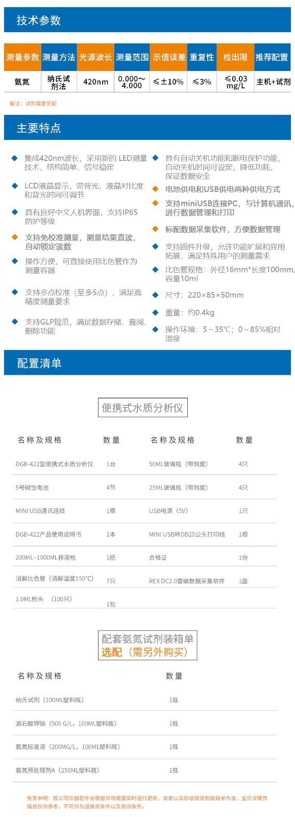 上海雷磁DGB-422便攜式水質(zhì)測定儀免校準測量氨氮檢測儀測定儀