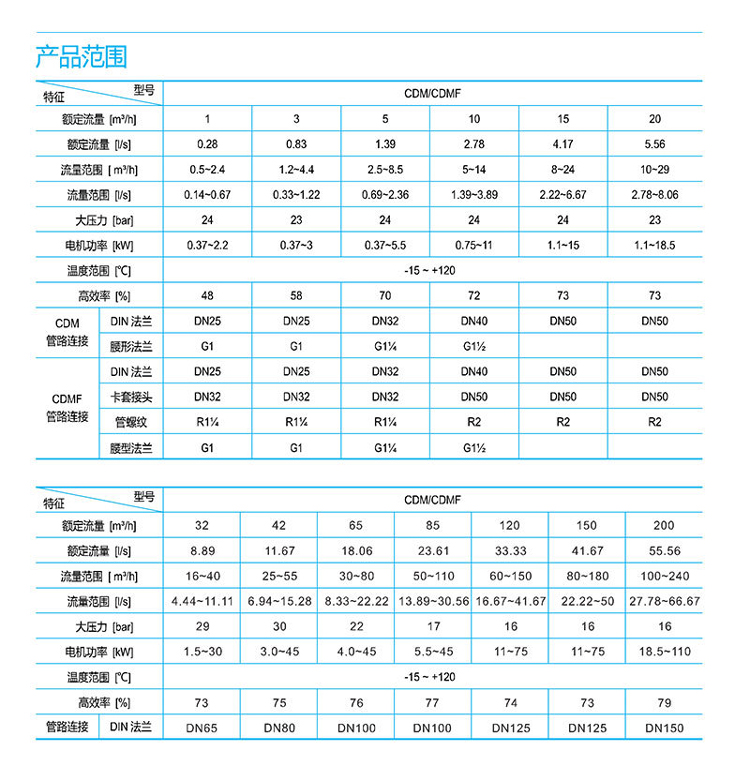 南方CDM/CDMF系列為參照歐洲標準新自主研發的新一代、高效率非自吸立式多級離心泵。產品采用全新的工業設計,能效指標達到MEI≥0.7,具有節能、低噪、環保及機構緊湊、外觀美觀、重量輕、使用維護方便、可靠性高等特點。
