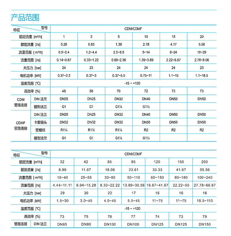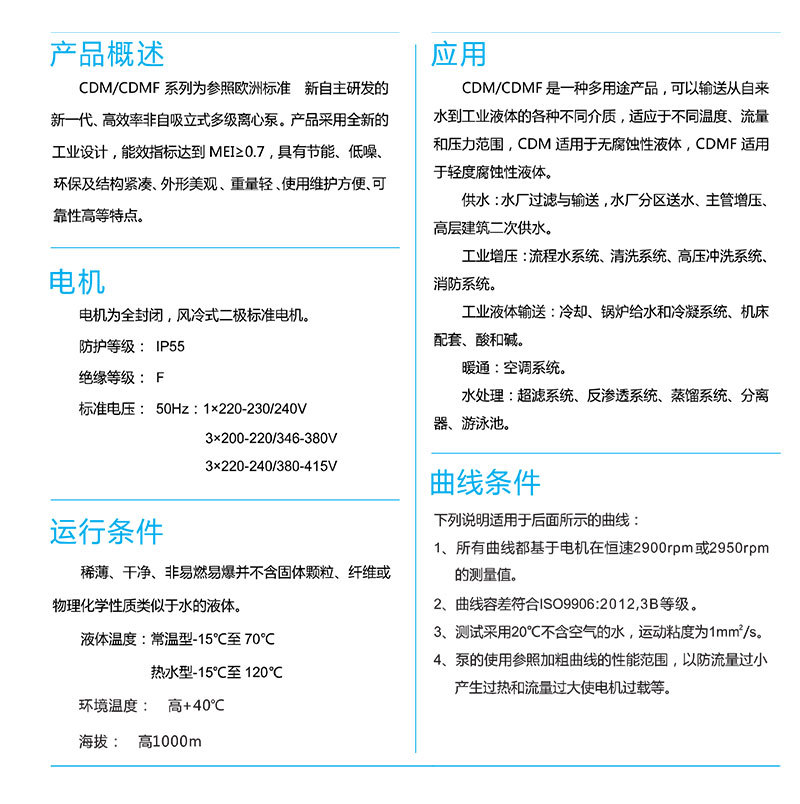 南方CDM/CDMF系列為參照歐洲標準新自主研發(fā)的新一代、高效率非自吸立式多級離心泵。產(chǎn)品采用全新的工業(yè)設計,能效指標達到MEI≥0.7,具有節(jié)能、低噪、環(huán)保及機構(gòu)緊湊、外觀美觀、重量輕、使用維護方便、可靠性高等特點。