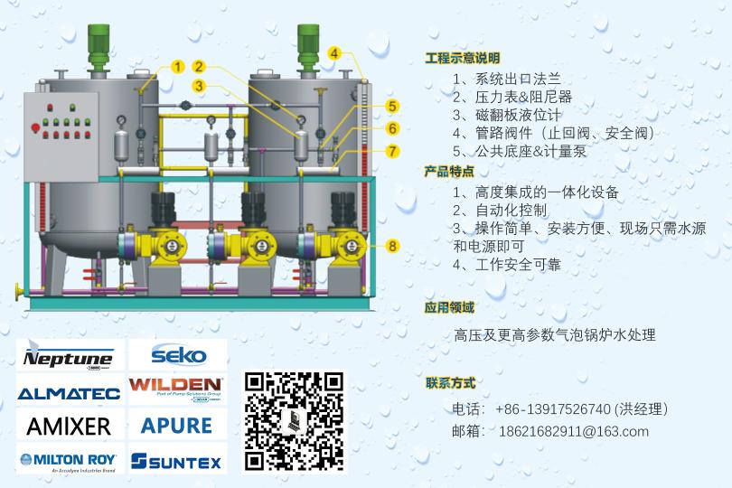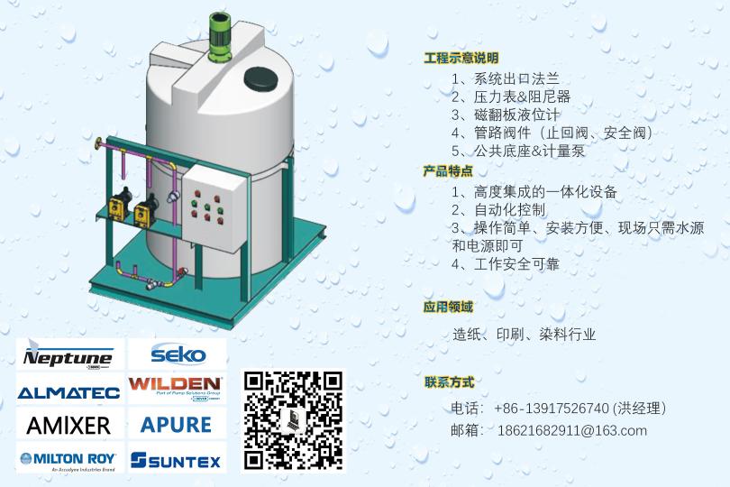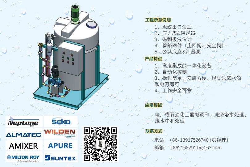循環(huán)水加藥裝置,示蹤劑加藥裝置,遠(yuǎn)程控制DCS加藥裝置,PAC加藥裝置,PAM加藥裝置,酸堿中和加藥裝置,冷卻塔加藥裝置,干粉投加裝置,高分子自動(dòng)泡藥機(jī),PAM自動(dòng)制備系統(tǒng),絮凝劑制備系統(tǒng),PAC自動(dòng)溶解混合配制裝置,純水反滲透裝置,軟化水系統(tǒng),過濾系統(tǒng),遠(yuǎn)程控制系統(tǒng),安全閥,背壓閥,流量校正柱,管道式流量計(jì)等。